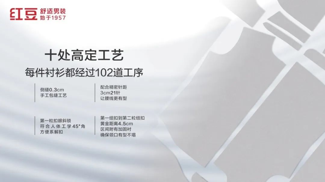 纵观红豆男装多年来在产品设计上的创新突破,无不是以用户需求为出发点――注重品质与细节,减轻身体的负担和束缚,跨越多个场景、适应多元需求……而这些独具匠心的设计和应用,最终将“舒适”的感受具象化,也让这个65年历史的品牌历久弥新,时至今日依然迸发出强大的能量。红豆0感舒适衬衫正是红豆男装在一件衬衫上将“舒适”具象化的成功实践。一直以来,衬衫容易皱、不合身、不舒服的“痛”感一直没有得到很好的改良,红豆男装敏锐地抓住了这一痛点,利用设计上的创新弥补了衬衫长久以来的“短板”,从面料、版型、设计、工艺、辅料全方位诠释了舒适的全新定义。设计的本质是服务于人,设计要关注人、关心人,红豆男装也因此将“人的舒适感受”作为这件衬衫的最高准则。红豆0感舒适衬衫从面料开始,首创红豆超细旦纤维配比,实现了免烫、易打理;结合300万人体工程学数据,由多位10年以上经验的打版师反复修改,最终首创红豆5项3D立体剪裁技术,在舒适的基础上兼顾挺括有型;此外,可拆卸领插片、领底反衬、第一粒扣眼斜锁等高定工艺,演绎一件衬衫的匠心美学,彰显奢侈品级别的高级质感。